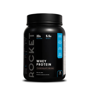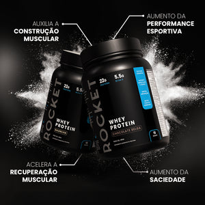 Rocket 100% Whey está disponível em 2 sabores, versões pote de 900g, sabor baunilha e chocolate belga.